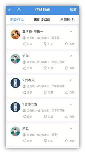 (1)教师发送朗读作业(可以是电脑Web端或手机APP人人通空间发布作业,学生通过手机APP人人通空间完成)。作业完成时间是:学生休息日,因为只有休息日学生回到家才能接触到手机,完成作业的提交。设计朗读作业的初衷是:学生到家后刷视频、玩游戏是常态,我们要用完成作业的时间来挤占刷视频、玩游戏的时间。因为有相关的制度的制约,我们对作业的要求是自愿参加。安排朗读作业的目的是:统编语文教学中发现学生的朗读能力普遍偏弱,在课堂上逐一提高是不太现实的,在休息日,自愿的参与,既不违背相关政策,又能提高学生的朗读能力。最重要的是可以方便的对不同学生提出不一样的要求,更适合学生的个性化需求。